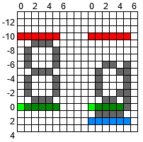 Looking at the output in a magnifying glass shows how the different characters are laid out. If you were to draw a single character using the fillText function and set the x and y coordinates with left alignment, you’d get output like that shown below. The light green pixel shows the base X and y locations you specified and the values shown in the margin are offsets from that base point.