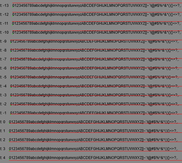 Today I’ll describe the sizing of characters so the graph object knows exactly how to place them. I hacked together a tool that prints out letters in a specified font and then draws horizontal lines at various offsets from the baseline. A section of that output is shown below:
