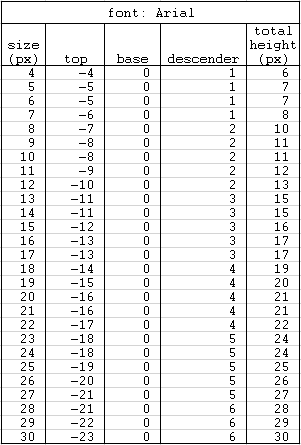 Rerunning that exercise for Arial fonts from 4px to 30px allowed me to build the following table.