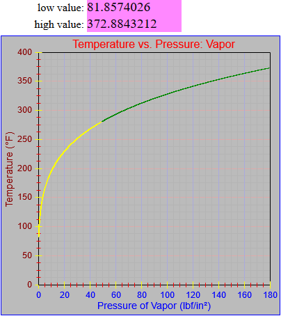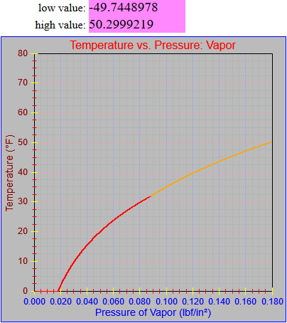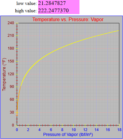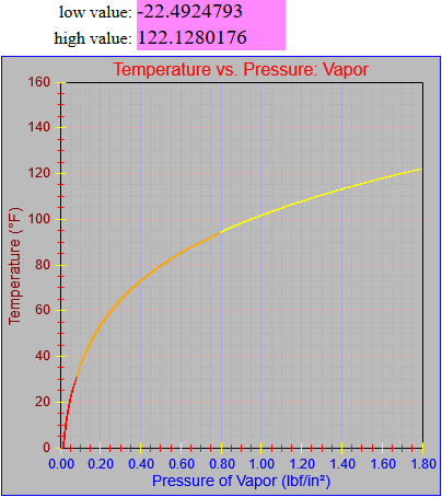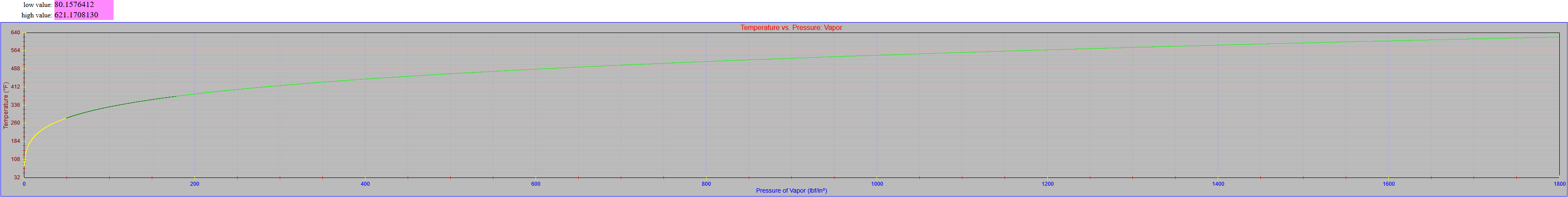 function PFind_T(P) { var temp = 0.0; if (P <= 0.0) { graphCycle = graphCycleBottom0; } else if (P < 0.0019) { graphCycle = 1; temp = (-40 + (0.0019 - P)*(-7142.857)); } else if (P < 0.08866) { graphCycle = 2; P = Math.log(P); P = P + 6.26590139280974E+0000 + 2; temp = -6.89351170861096E+0001; temp += ( 1.30050423829122E+0001 * P); temp += ( 7.31258080071309E-0001 * P * P); } else if (P <= 0.8) { graphCycle = 3; temp = 3.33934342833700E+0001 * P; temp += ( 2.17077559430164E-0001 / P); temp += (-2.49565709833529E+0001 * Math.sqrt(P)); temp += ( 2.81308744499854E+0001 * Math.log(P)); temp += (-1.25784522492054E+0001 * P * P); temp += ( 3.34979532697040E+0000 * P * P * P); temp += 1.02298078764073E+0002; } else if (P <= 50) { graphCycle = 4; temp = -2.99124380544527E-0001 * P; temp += ( 2.68463065388278E+0000 / P); temp += ( 1.32892779311514E+0001 * Math.sqrt(P)); temp += ( 2.94664325500198E+0001 * Math.log(P)); temp += ( 1.51666454163202E-0004 * P * P); temp += ( 2.28440791389534E-0006 * P * P * P); temp += -1.56749381553382E+0001; temp += 1.01699999999953E+0002; } else if (P <= 180) { graphCycle = 5; temp = 3.74987064978268E+0000 * P; temp += ( 2.16828072878346E+0003 / P); temp += (-1.02468079912476E+0002 * Math.sqrt(P)); temp += ( 2.99347435622010E+0002 * Math.log(P)); temp += (-3.92313778545628E-0003 * P * P); temp += ( 3.50250493113408E-0006 * P * P * P); temp += -6.67984428873286E+0002; temp += 2.81029999999795E+0002; } else if (P <= 1800) { graphCycle = 6; temp = -7.86998246486519E-0002 * P; temp += (-4.87149019710720E+0002 / P); temp += ( 9.75184636544145E+0000 * Math.sqrt(P)); temp += ( 2.73146506017656E+0001 * Math.log(P)); temp += ( 1.16067971316358E-0005 * P * P); temp += (-1.69705925255891E-0009 * P * P * P); temp += -2.56172361345496E+0002; temp += 3.73129999999888E+0002; } else { graphCycle = graphCycleTop0; temp = 0; } return temp; } |