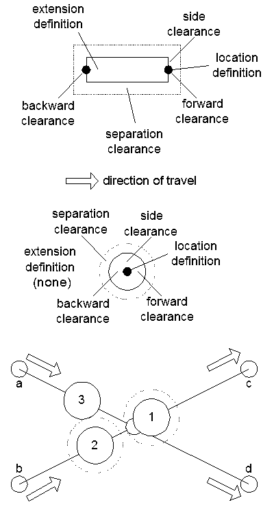 - side clearance (S): It is assumed for the time being that all entities will be symmetrical across the direction of travel. This distance is from the center line of the entity to either side of the entity. For a circular entity this distance is equal to the entity’s radius.
