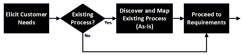 If there is no existing process, i.e., a new (greenfield) process is being built from scratch, then a form of discovery will occur during Requirements and Design.